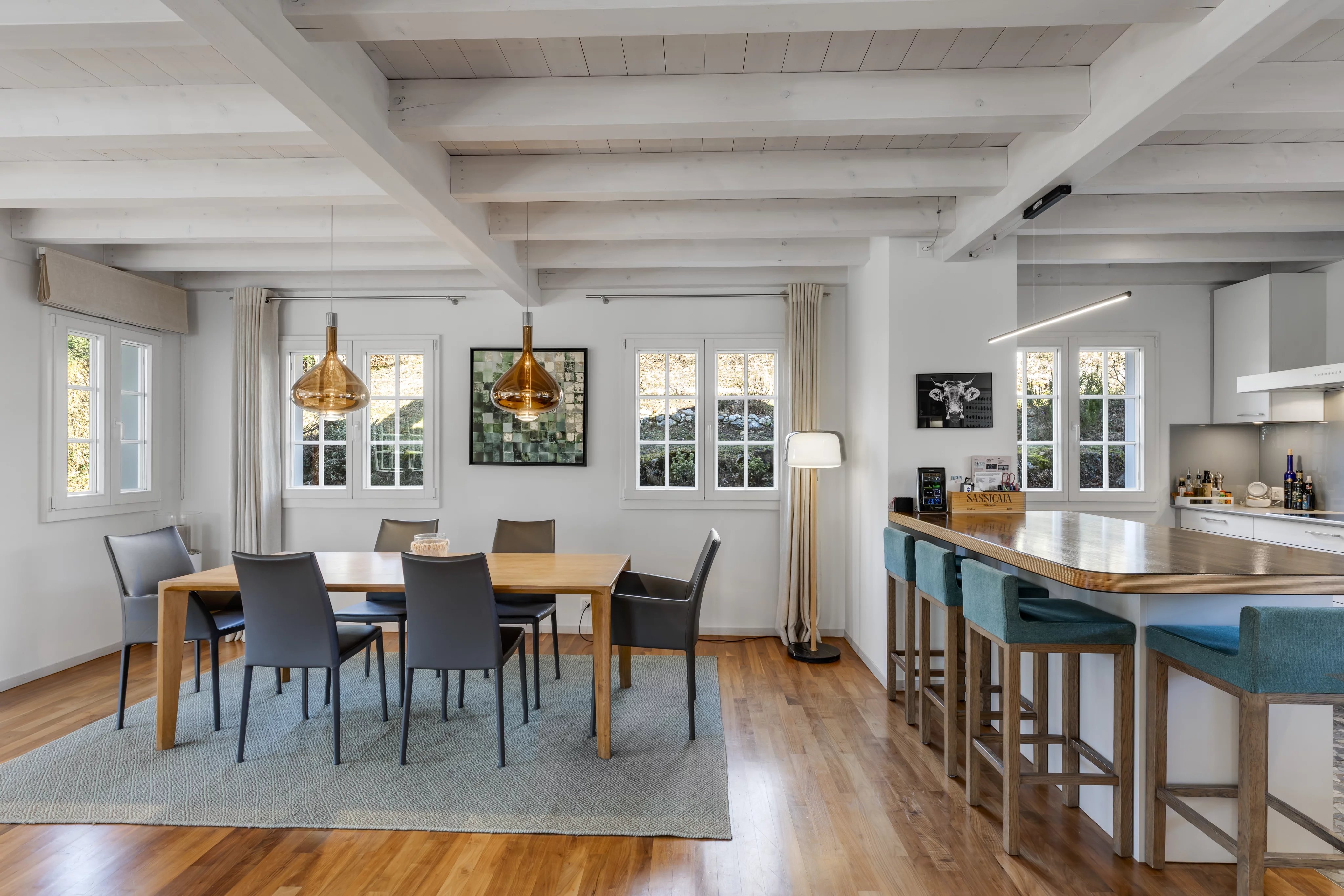 Das Wohnzimmer öffnet sich zu einer wunderschönen, nach Süden ausgerichteten Deckterrasse, auf der sich ein Pool befindet, der ideal für entspannende Momente ist.