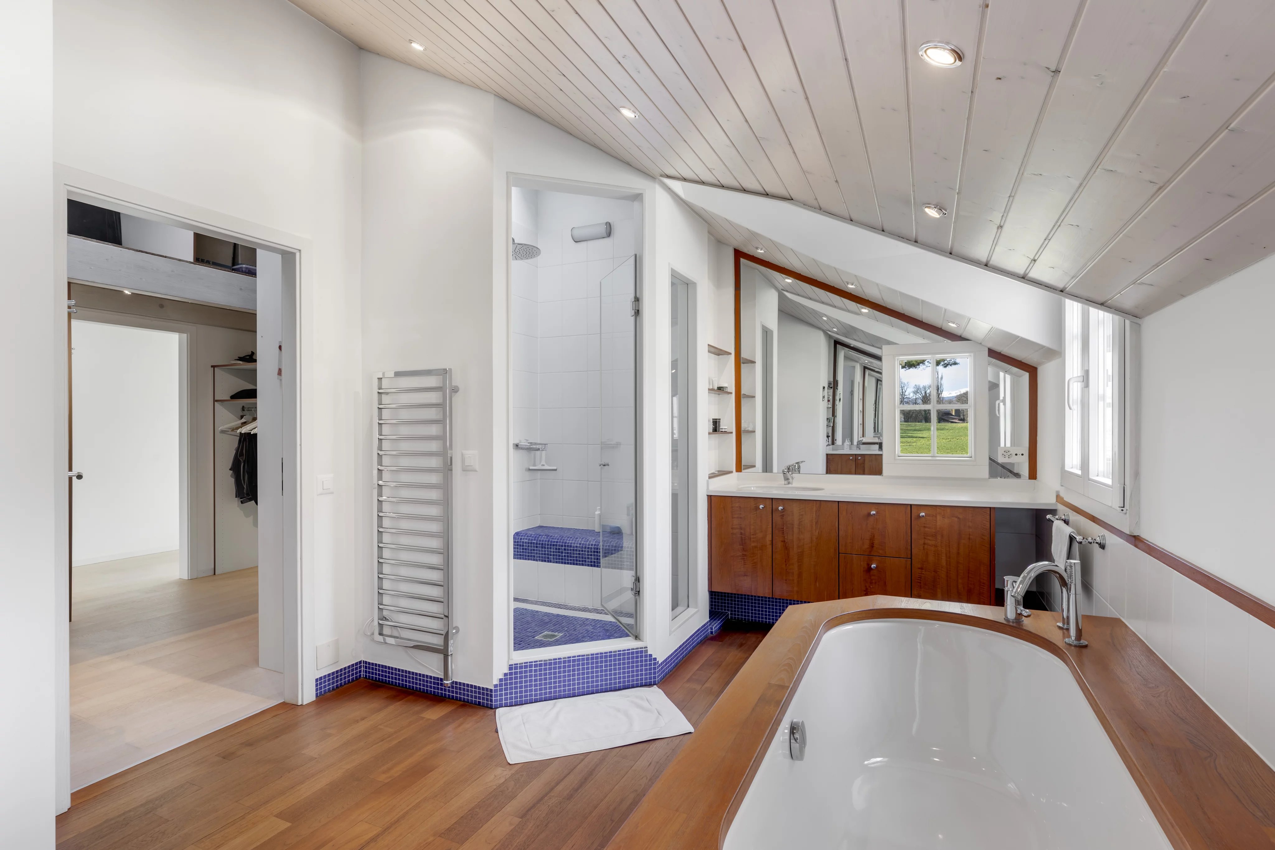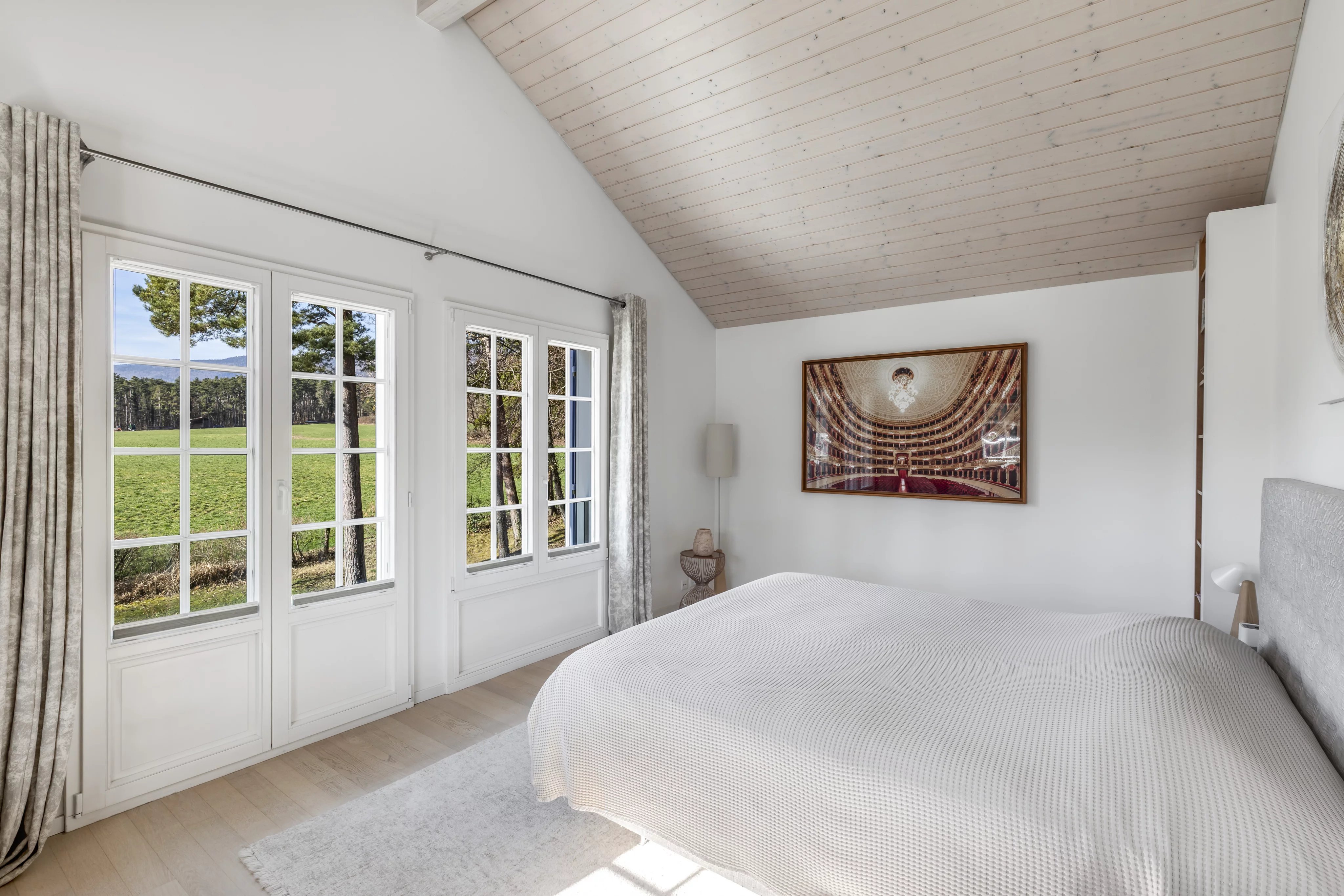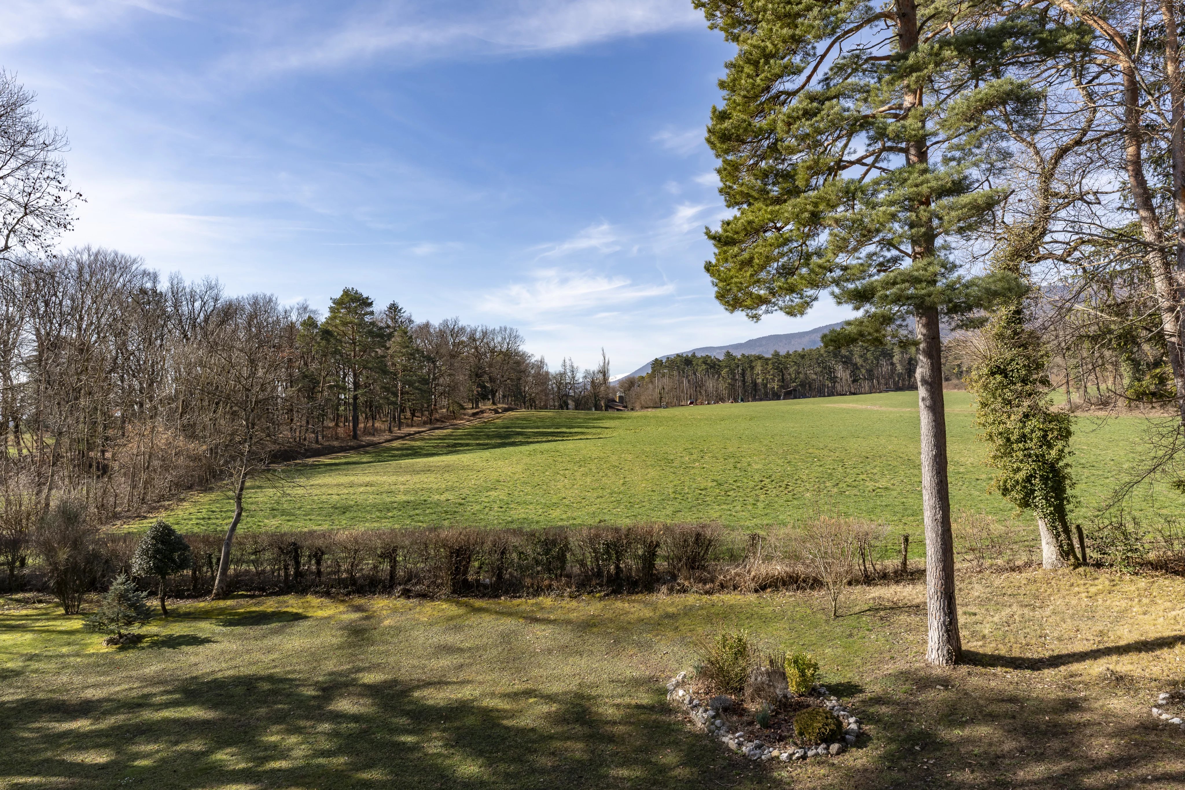 Die Umgebung ist äußerst zauberhaft, mit der umliegenden Landschaft und dem Wald. Der Gesang der Vögel lädt zur Ruhe ein, das Geräusch des Windes in den Bäumen zur Meditation. Diese bukolische Umgebung ist umso verführerischer, wenn man bedenkt, dass man in nur 15 Minuten im Stadtzentrum von Nyon und in 30 Minuten am Flughafen von Genf ist.