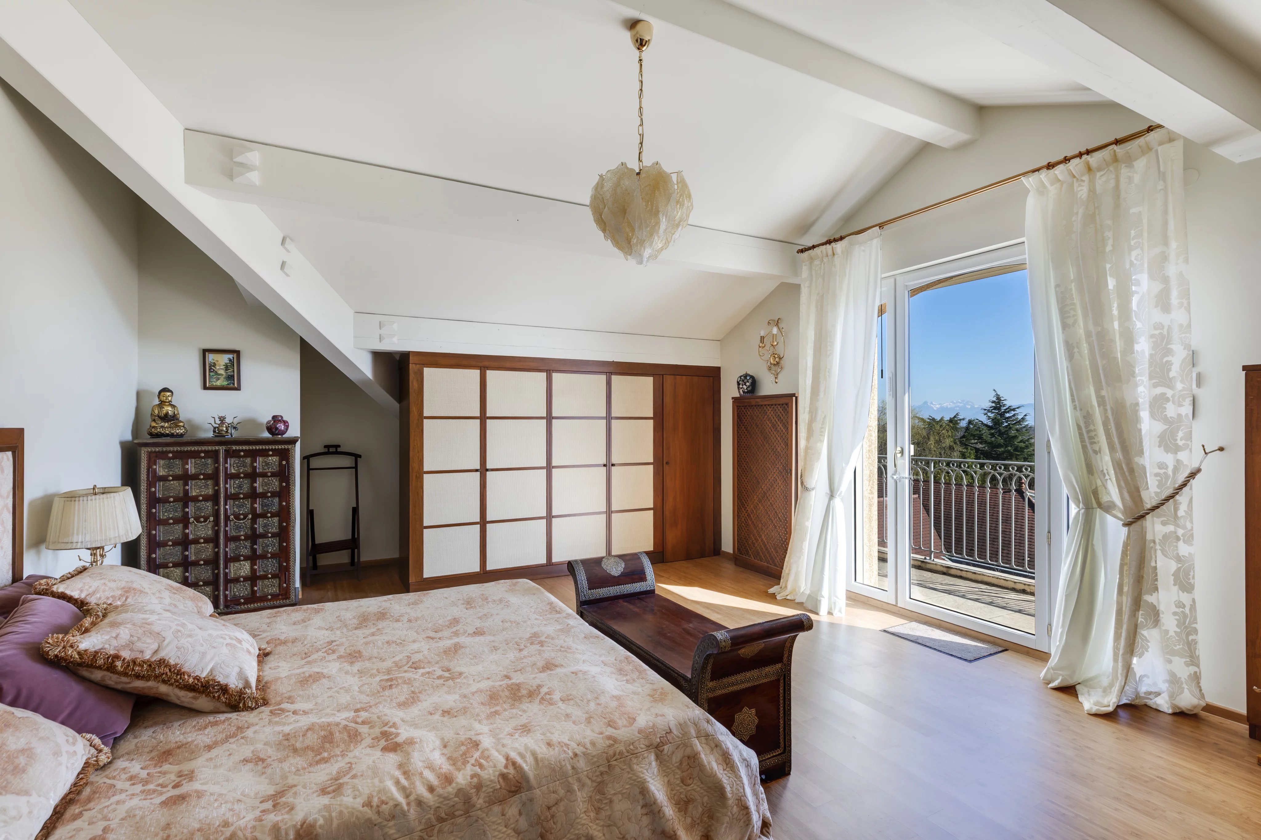 Poussez le portail, et tout change. Perchée sur les hauteurs du quartier résidentiel le plus prisé de Divonne-les-Bains, cette demeure d'exception impose sa présence avec discrétion. Elle jouit d'un emplacement sans équivalent, où le Mont-Blanc s'impose en ligne de mire, encadré par le parc comme un horizon dont on ne se lasse jamais.