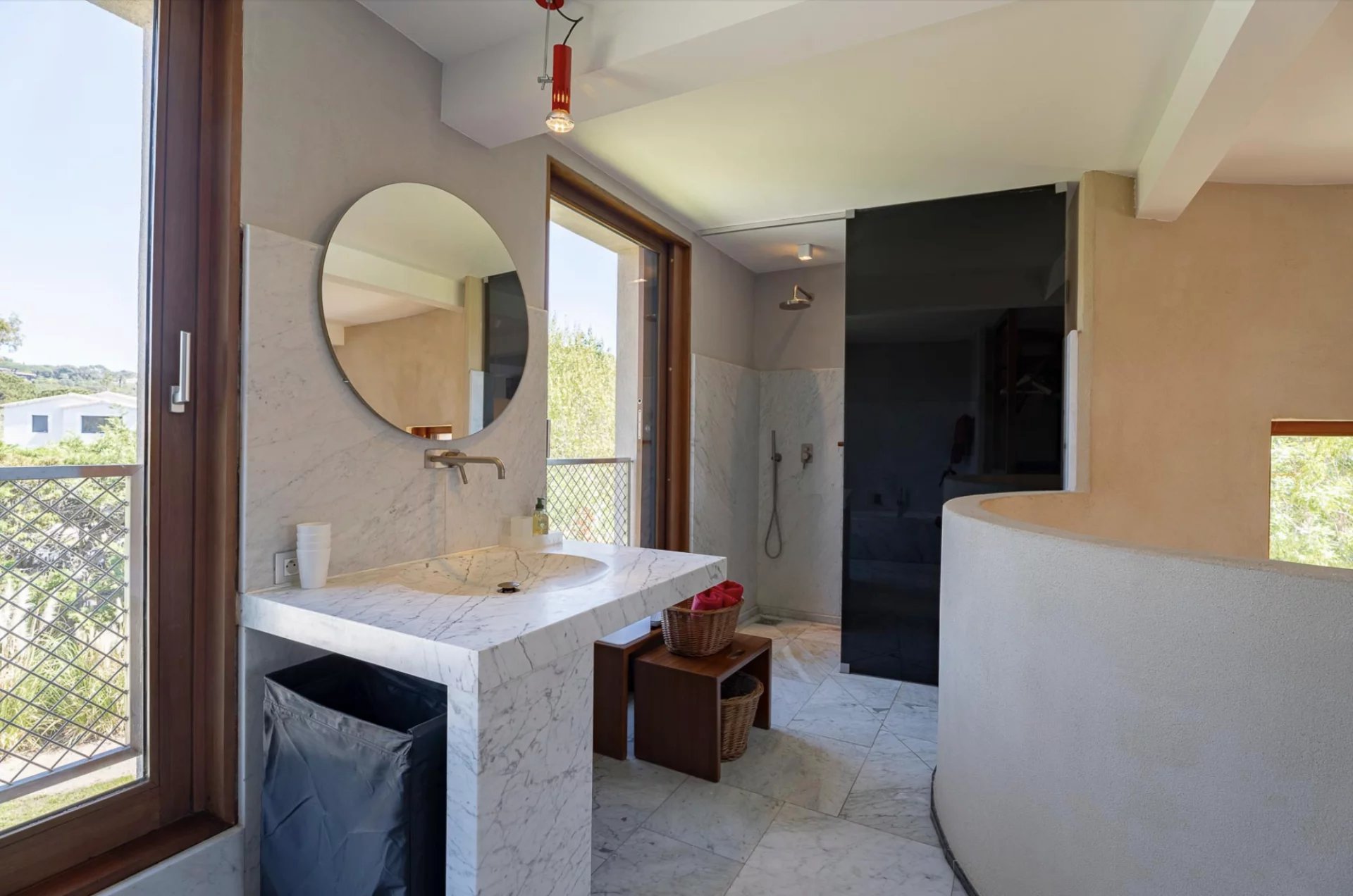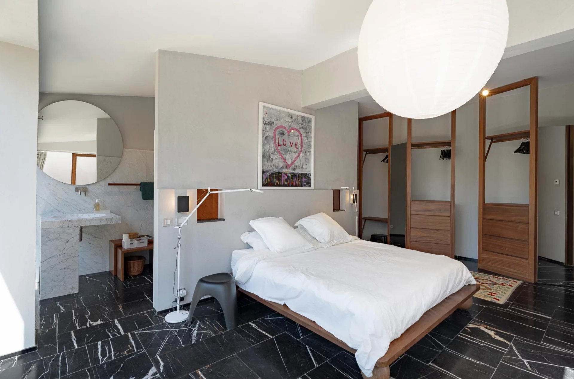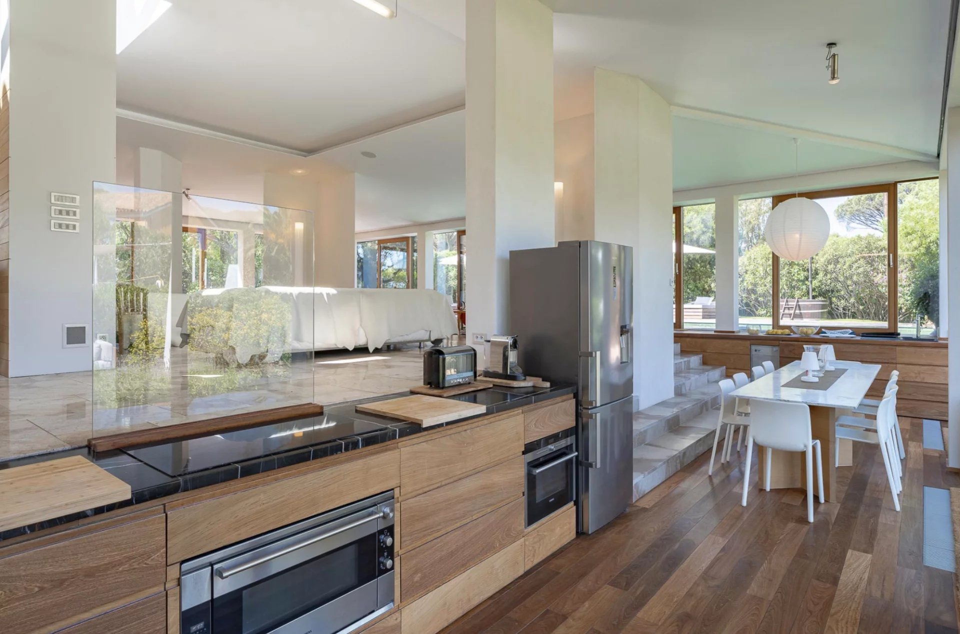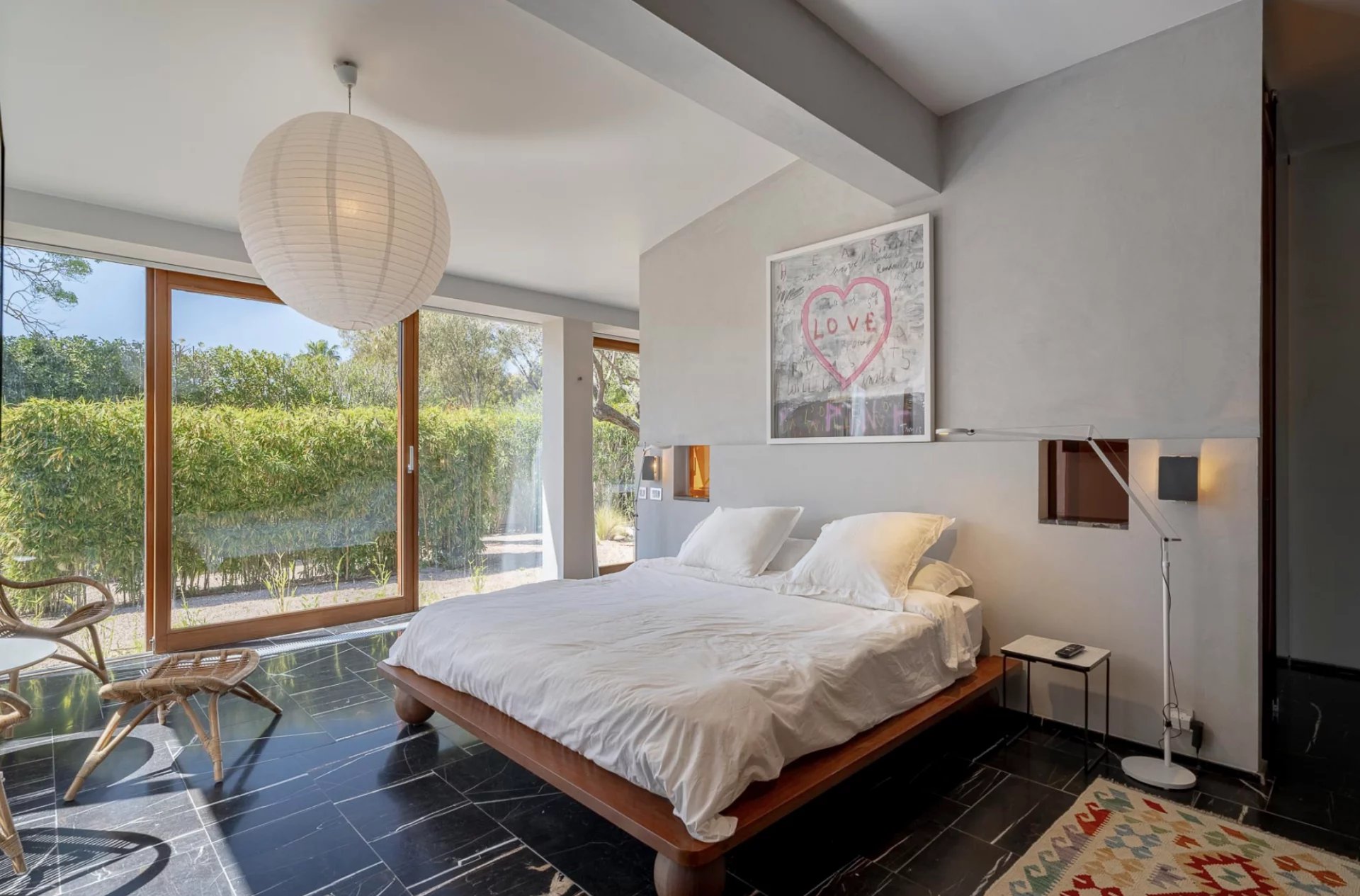 De belles oeuvres d'arts ornent les murs de la maison, des peintures ou des photos très contemporaines et de valeur.La piscine tout le long du salon donne l'impression que la maison est sur l'eau, le deck se prolonge à l'intérieur avec le parquet en bois. Toutes les chambres ont été pensées et étudiées pour être confortables, esthétiques et fonctionnelles : les dressings sont en bois légers et ouverts comme des sculptures, la literie est toute neuve et tous les lits sont des king-size. Les salles de bain sont en marbre avec des belles vasques rondes sur pied spécialement dessinées par l'architecte.