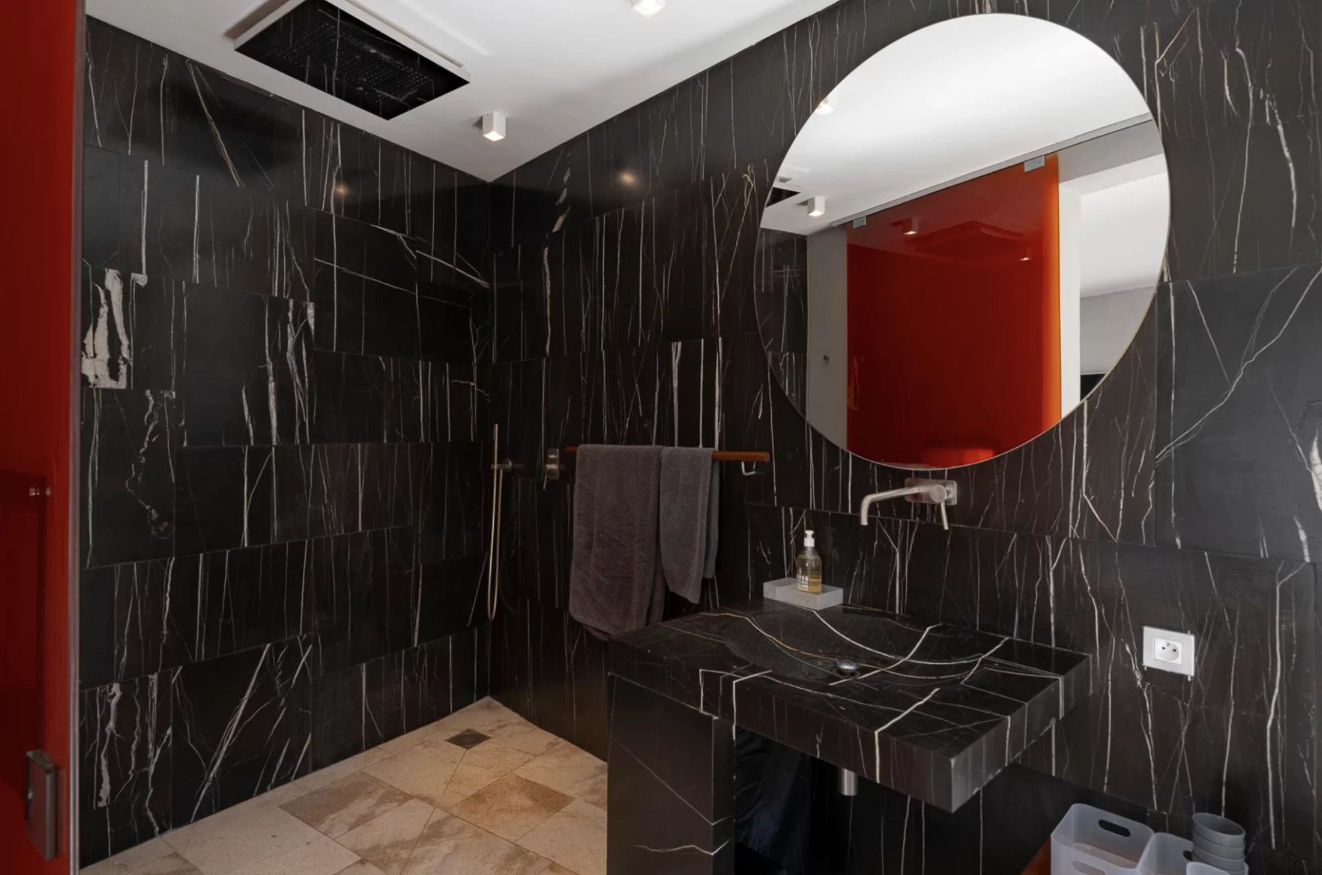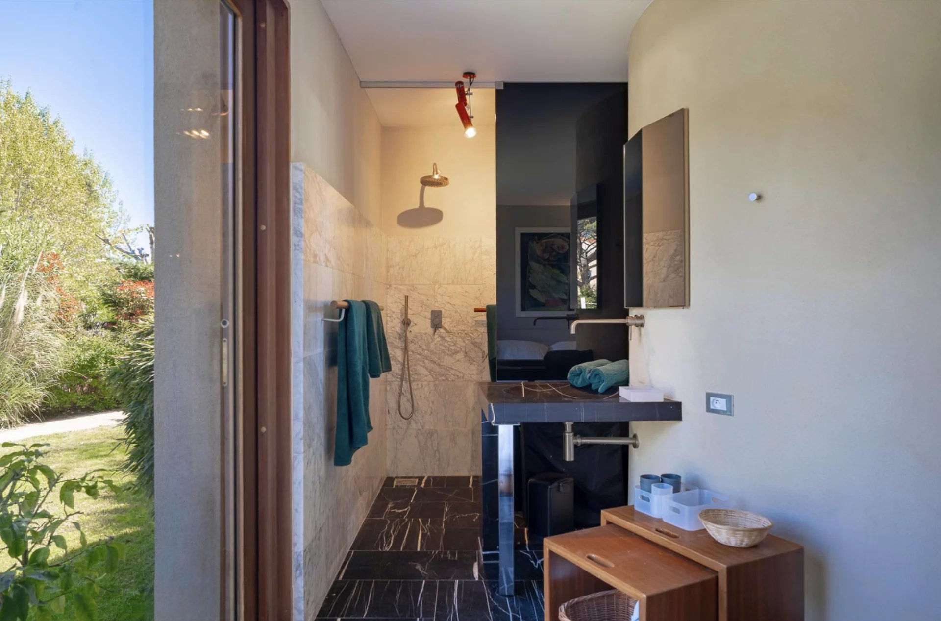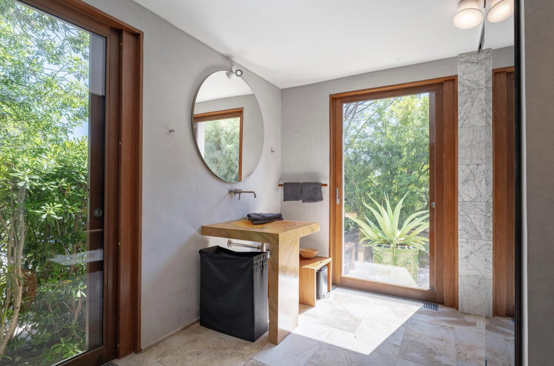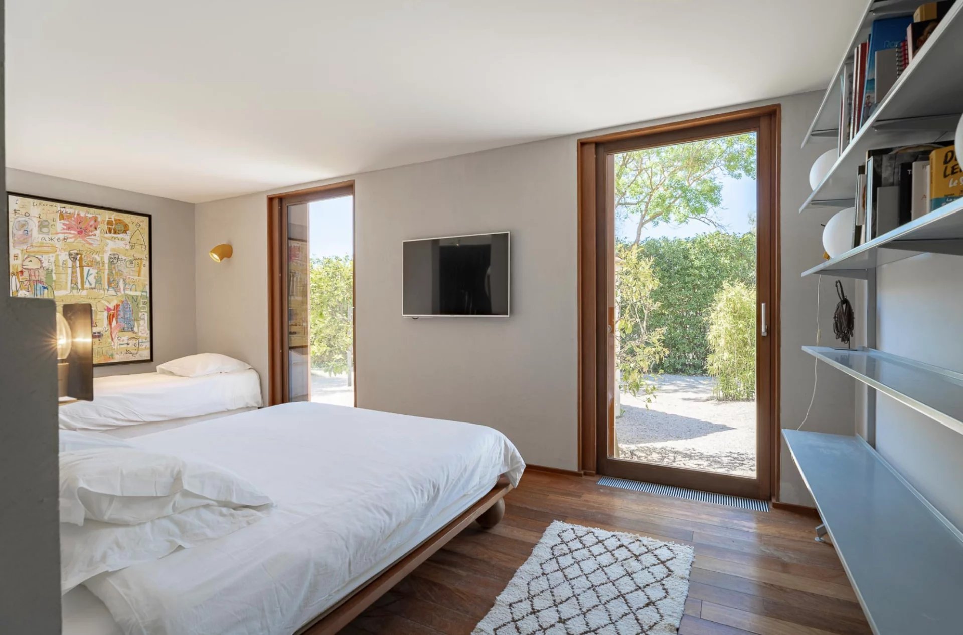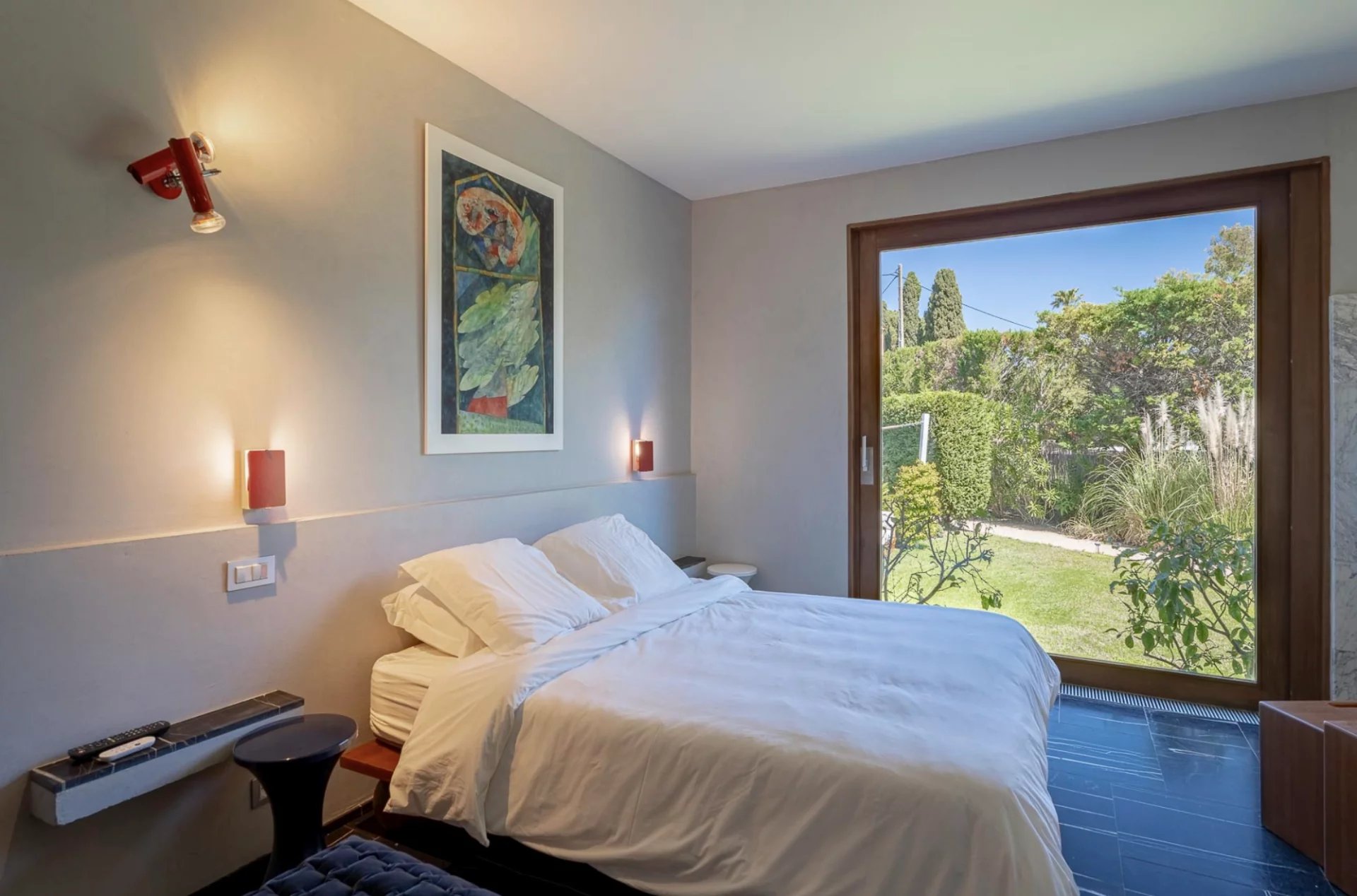 De belles oeuvres d'arts ornent les murs de la maison, des peintures ou des photos très contemporaines et de valeur.La piscine tout le long du salon donne l'impression que la maison est sur l'eau, le deck se prolonge à l'intérieur avec le parquet en bois. Toutes les chambres ont été pensées et étudiées pour être confortables, esthétiques et fonctionnelles : les dressings sont en bois légers et ouverts comme des sculptures, la literie est toute neuve et tous les lits sont des king-size. Les salles de bain sont en marbre avec des belles vasques rondes sur pied spécialement dessinées par l'architecte.