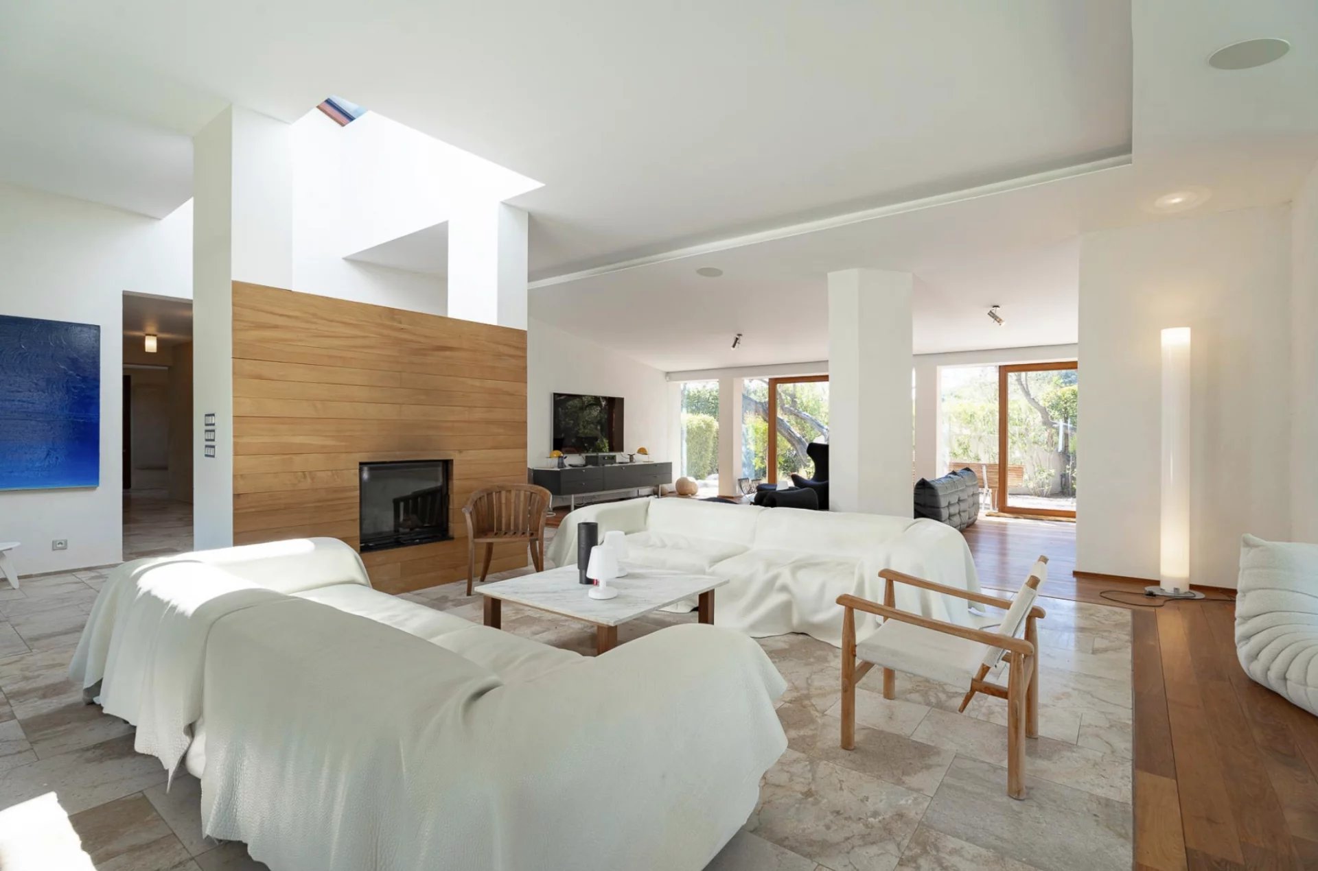 Le salon est incroyable, 180 m2 de plain-pieds, entouré de larges baies vitrées en bois donnant sur le jardin et qui permet de vivre dans plusieurs espaces : un coin salon avec cheminée, un autre salon avec une télévision à grand écran plat, une salle à manger avec une grande table en bois et une vaste cuisine qui donne sur le jardin comprenant une longue table en marbre idéale pour prendre les repas tous ensembles.