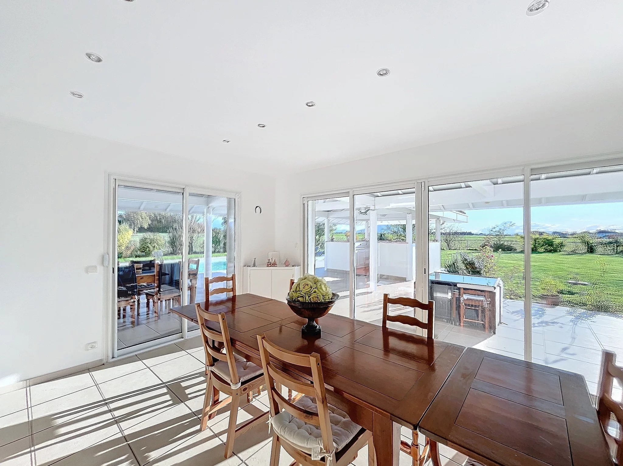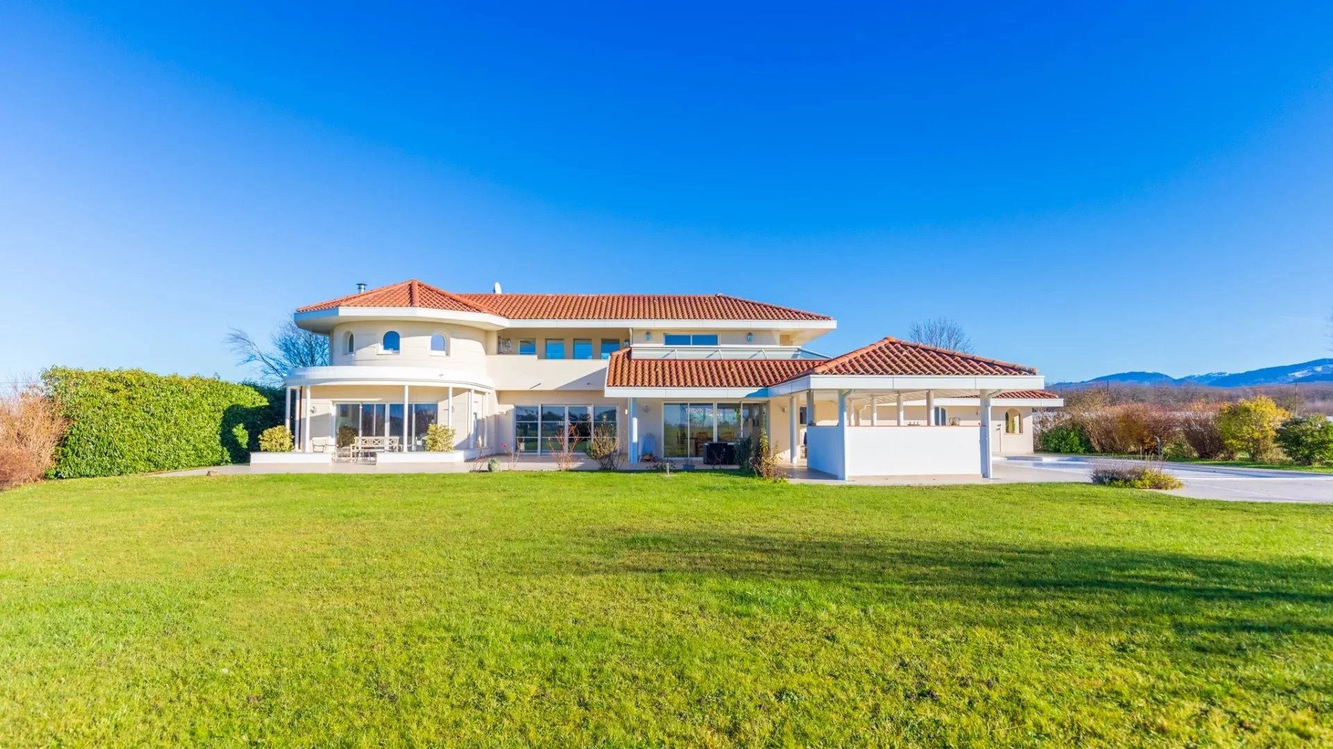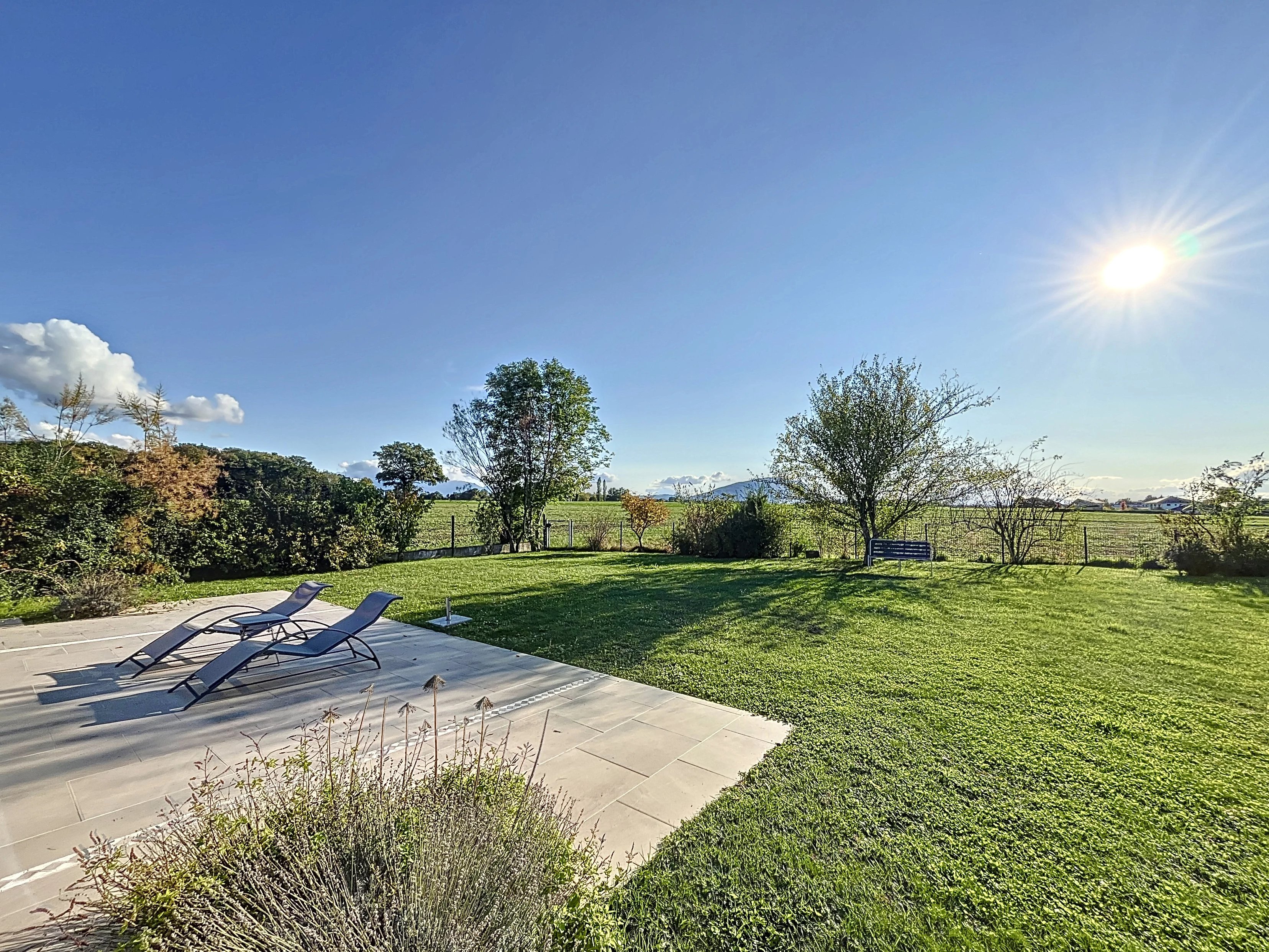 Located in the immediate vicinity of the Swiss border, this elegant Mediterranean-inspired property enjoys an exceptional living environment, combining absolute tranquillity with breathtaking views over the surrounding countryside, Mont Blanc and the Jura mountains.